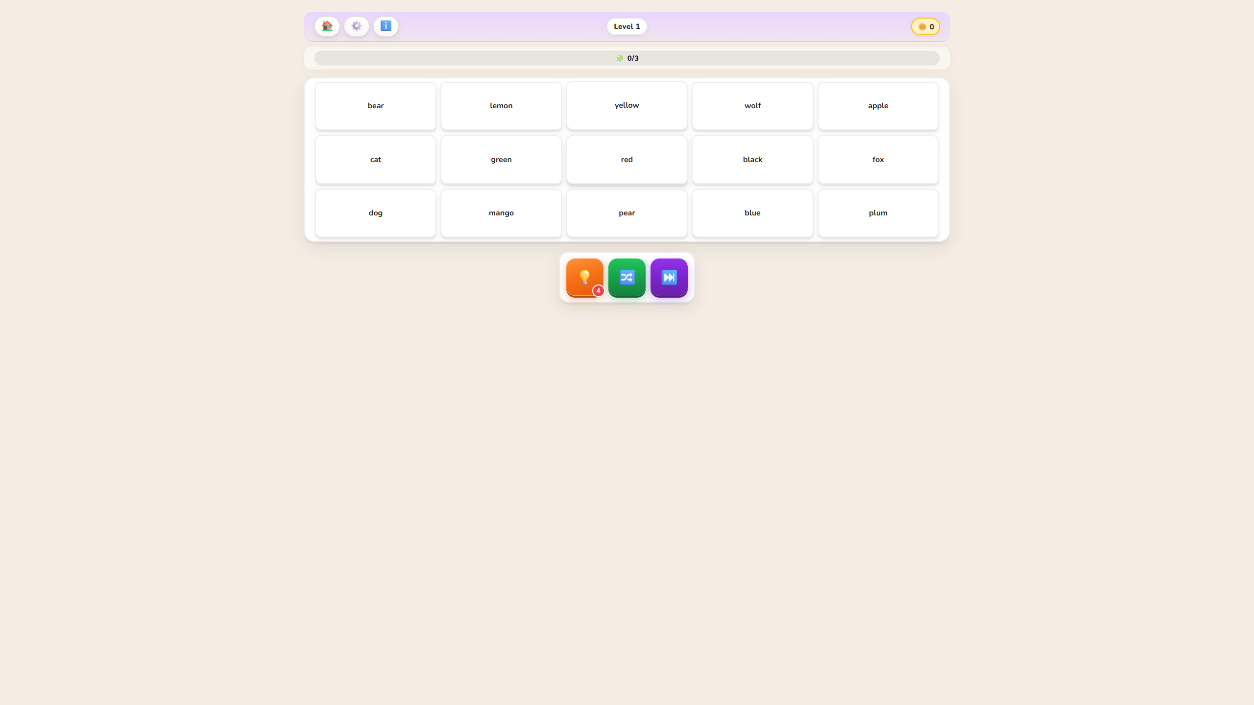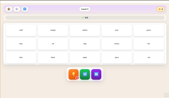 Word Puzzle is a braint easing sorting game where every tile has its place — and your job is to find it. Drag and drop words across the board to build complete rows, each belonging to a single category. Simple to start, satisfying to master.